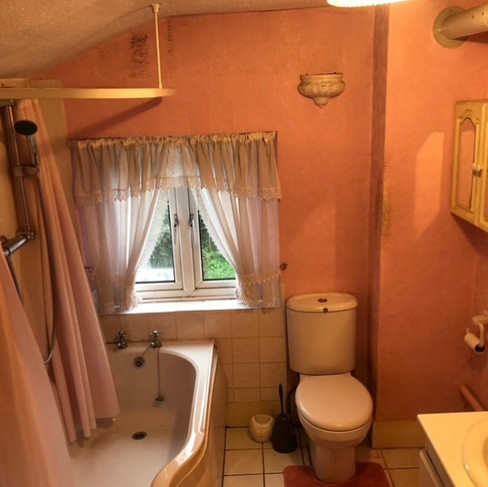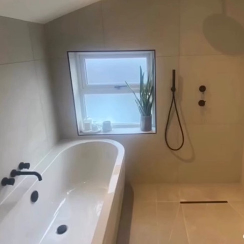 The job involved complete strip out of the old bathroom, new pipework, underfloor heating, new window and door, new bathroom suite, replastering and tiling throughout.